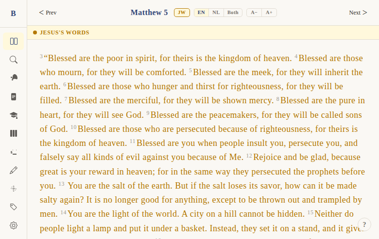 A special "JW" (Jesus Words) mode can be activated via a button in the nav bar or by adding ?jw=1 to the URL. In this mode: