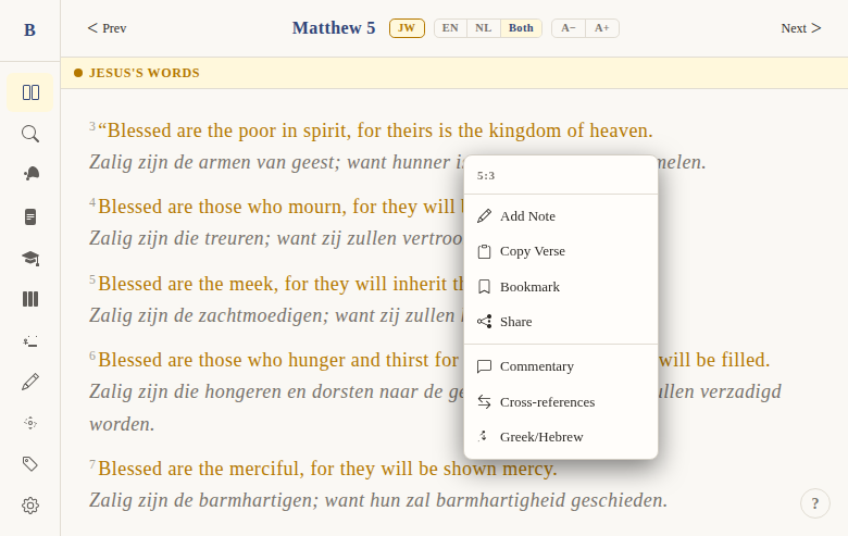 Bookmark action: Available in the verse context menu as "Bookmark" with a bookmark icon.