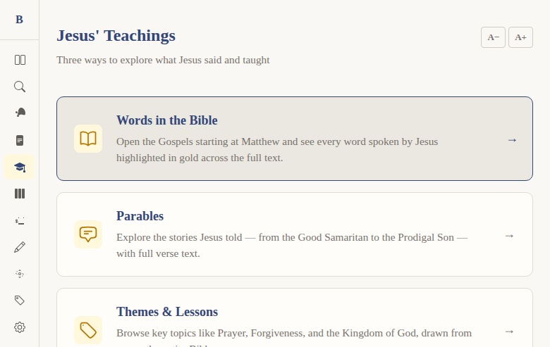 Problem: BibleWeb has three different ways to explore Jesus' teachings — his direct words in the Gospels, his parables, and thematic topics. Users need a single starting point that connects all three.