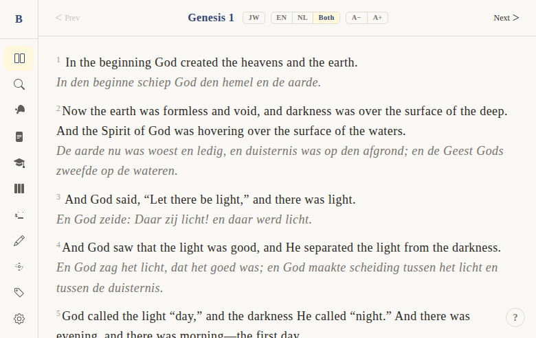 Solution: A three-way toggle (EN / NL / Both) that lets users view English only, Dutch only, or both translations displayed together verse by verse. In "Both" mode, each verse shows the BSB text on one line and the Statenvertaling below in italics.