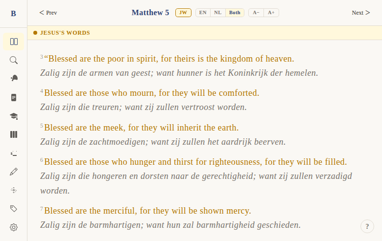 Problem: BibleWeb serves Dutch-speaking users who may not be comfortable navigating an English-only interface. The entire app UI — menus, buttons, labels, messages — needs a Dutch version.